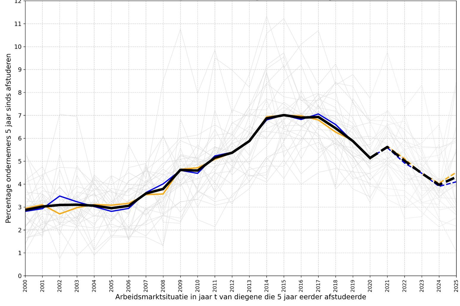 Figure 1 Percentage of entrepreneurs within five years after graduation in Dutch higher education (2000–2025), based on an analysis of approximately 500,000 alumni. The graph shows the averages for universities (blue), universities of applied sciences (orange), and the total (black) as thick lines, compared to individual institutions in grey. The dotted period (2021–2025) marks a preliminary trend, for which the dataset is still being expanded.
