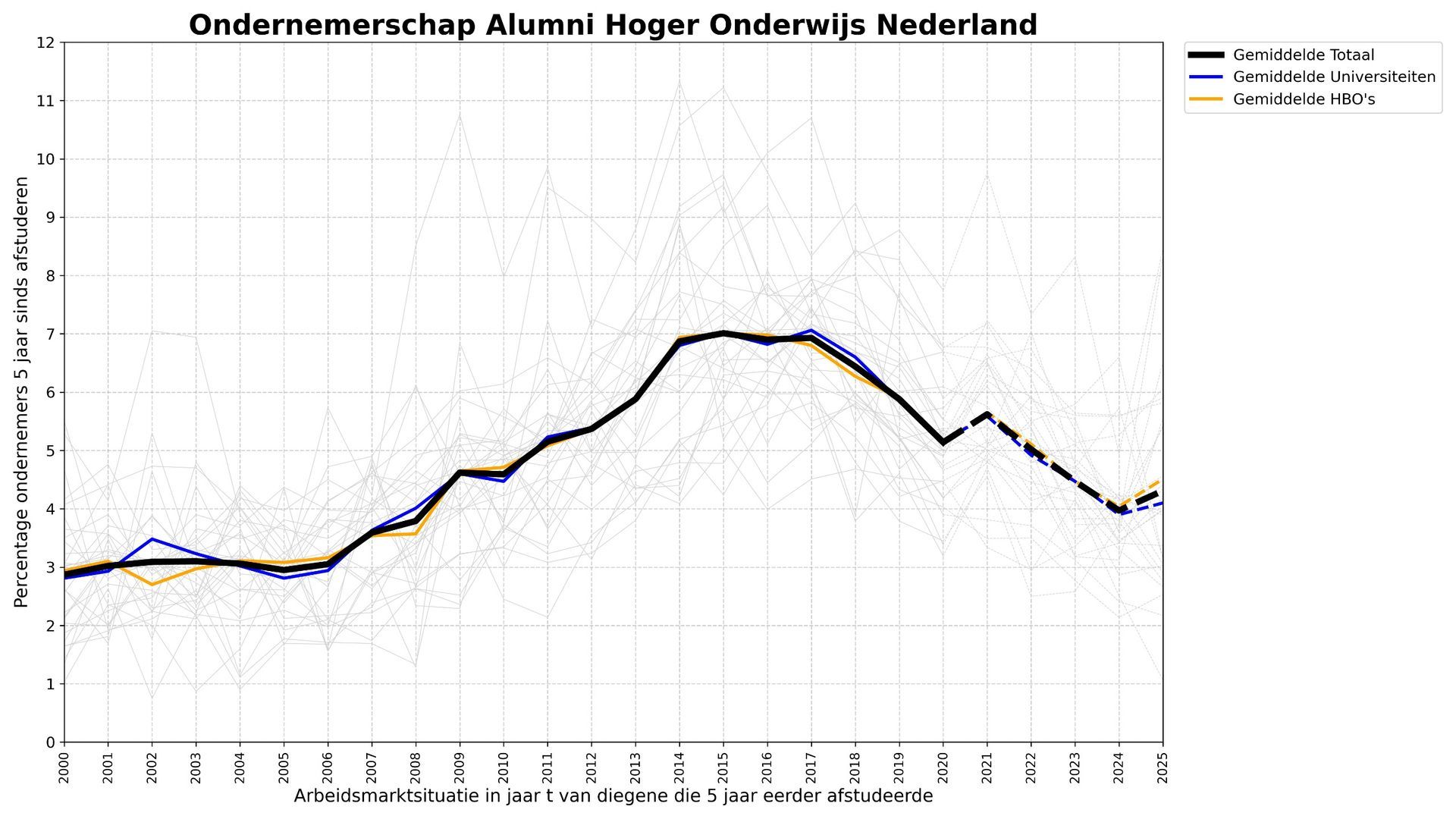 Figuur 1 Percentage ondernemers binnen vijf jaar na afstuderen in het Nederlands hoger onderwijs (2000–2025), gebaseerd op een analyse van circa 500.000 alumni. De grafiek toont de gemiddelden voor universiteiten (blauw), hogescholen (oranje) en het totaal (zwart) met dikke lijnen, afgezet tegen de individuele instellingen in grijs, waarbij het gestippelde traject (2021–2025) een voorlopige trend markeert waarvoor de datareeks momenteel nog wordt aangevuld. De dataset omvat de universiteiten Erasmus, Maastricht, Open Universiteit, Radboud, RUG, TU Delft, TU Eindhoven, Tilburg, Leiden, Twente, Utrecht, UvA, VU en Wageningen, en de hogescholen Avans, Breda, Den Haag, Fontys, Hanze, Inholland, Leiden, Rotterdam, Utrecht, HvA, HAN, HZ, Saxion, Van Hall Larenstein, Windesheim en Zuyd ; wegens onvoldoende datakwaliteit zijn Aeres, AHK, ArtEZ, Codarts, Design Academy, Gerrit Rietveld, KABK, HKU, NHL Stenden en de Universiteit voor Humanistiek uitgesloten